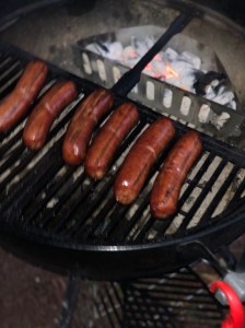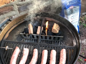 are where the party is in my opinion. Pick your favorite savory sausage and throw it on the grill to smoke. This requires you to set up a 2-zone fire. A 2-zone fire simply means put half the coals on one end of the grill and leave the other half without any coals. I suggest getting a charcoal basket shaped like a half circle. Fill it with briquets and light it at one end. Throw a couple chunks of your favorite flavoring wood (Cherry, apple, hickory, pecan, mesquite, etc.) and let it come up to about 225°.