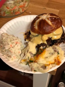 My wife and I lead a small group of about 16 people ranging in age from early 20s to early 40s. This demographic is ideal for getting feedback and I used our fall bonfire as a test kitchen to get some input on this recipe. The fires were lit, the pit hot, and the beer cold. It was time to get to grillin’. This burger is simple. It is an all-beef patty, with fried onions, smoked bratwurst, topped with homemade beer cheese, all on a pretzel bun. Beer cheese and pretzel bun are an easy combo win. The smoked sausage adds good smoke flavor that you cannot get into the burger because of the quick cook time. I prefer a smash burger over a thick patty any day. The reason for this is simple burger science. A good burger has a balanced bun to meat ratio. Either too much bun or too much meat makes a bad burger. Do not be fooled by the “more is better” concept. Give me a balanced burger any day over a 1lb mega burger.