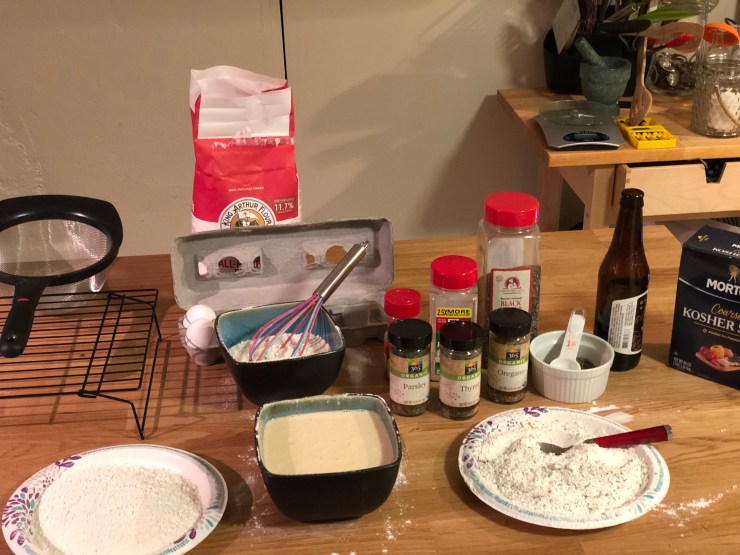 - Wet Coat – Ingredients: 1 cup flour, 1 egg, 8oz beer.For this coating you want to create a batter. I like to choose something with bubbles like beer or club soda to make the batter lighter. When picking a beer, do not choose something overpowering like a stout. You will lose a lot of more subtle flavors if you do this. In general, I put 1 egg per cup of flour. Whisk this all together. It should have the consistency of pancake batter. If it is too thin, then add some flour. If too thick add some more beer or club soda.
