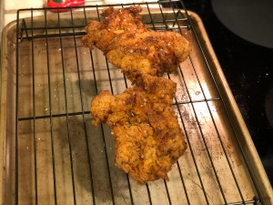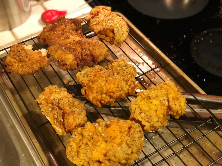 - Cool on a Wire Rack– Pull the chicken from the oil when it is finished cooking, and place it on a nearby cooling rack. Immediately sprinkle salt and pepper the chicken. Let the chicken rest for about 5 minutes to cool down before eating. Seriously, you will be tempted to take a bite. If you do, you will burn the life out of your tongue and will be unable to taste anything for a few days. By then, your delicious chicken will no longer be good.